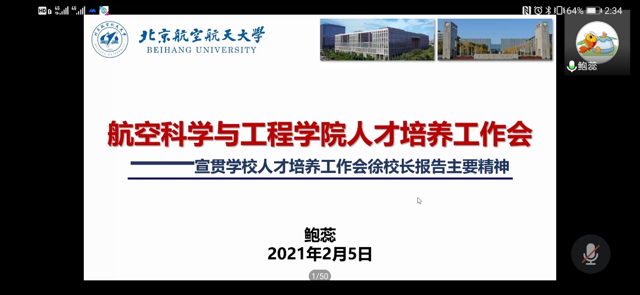 会上,常务副院长鲍蕊传达了学校人才培养工作会上徐校长题为《全员全过程全方位培养一流人才——北航高质量人才培养体系的思考与再塑》报告的主要精神。鲍院长强调了三个关键词“对标、传承、再塑”,一是要准确对标中央要求、主动应变,坚持创新引领发展,落实五育并举新要求,培养德智体美劳全面发展的社会主义建设者和接班人;二是要传承空天报国的红色基因、传承敢为人先的创新基因,坚守北航的鲜明特色和突出优势,创新改革探索人才培养模式和路径,再塑北航高质量人才培养体系;三是要以问题导向为出发点,以“授课课堂、科研课堂、社会课堂”三个课堂为抓手,构建本硕博全链条贯通培养的“三全”(all-Staff全员、all-Process全过程、all-Round全方位)人才培养体系。