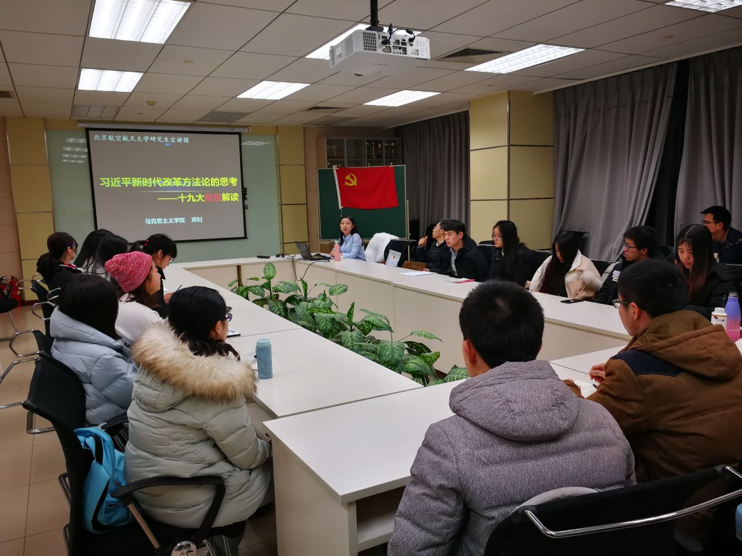 2018年1月3日,在新年伊始之际,37000cm威尼斯研究生硕士17052党支部与硕士17054党支部一起在C708共同学习了十九大精神北航研究生宣讲团系列活动主讲人之一,马克思主义学院郑钊同志的宣讲。党员们的热情高涨,C708座无虚席,其中SY17052党支部参与人数为17人,ZY17054党支部参与人数为14人,还有部分博士党支部成员参与学习。