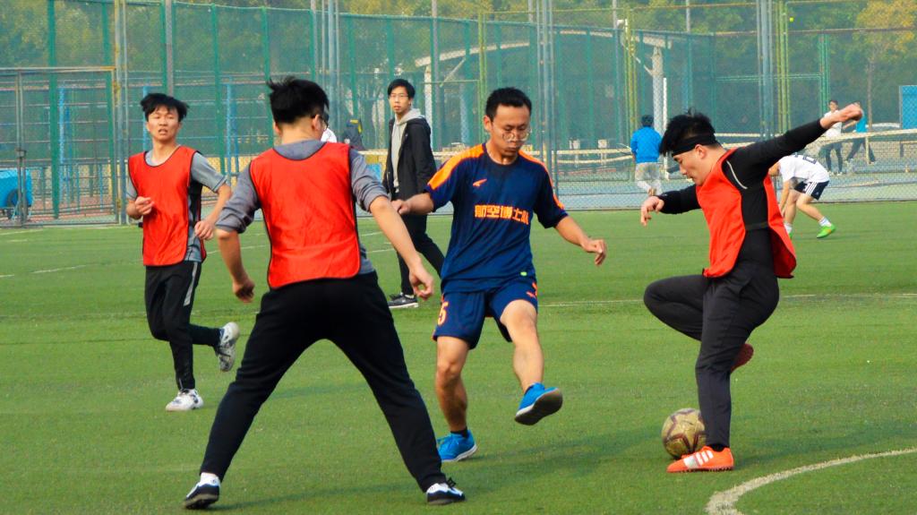 在上半场时间还剩5分钟时,专硕4班获得了一次角球机会。一脚高传中球堪称完美,正落到博士班的禁区之内,博士队后卫全力防守。但是此刻,幸运女神站在了一路拼搏的专硕4班这边,在空中划过优美弧线的足球打在了博士队防守队员身上直接入门,比分改写成2:1。